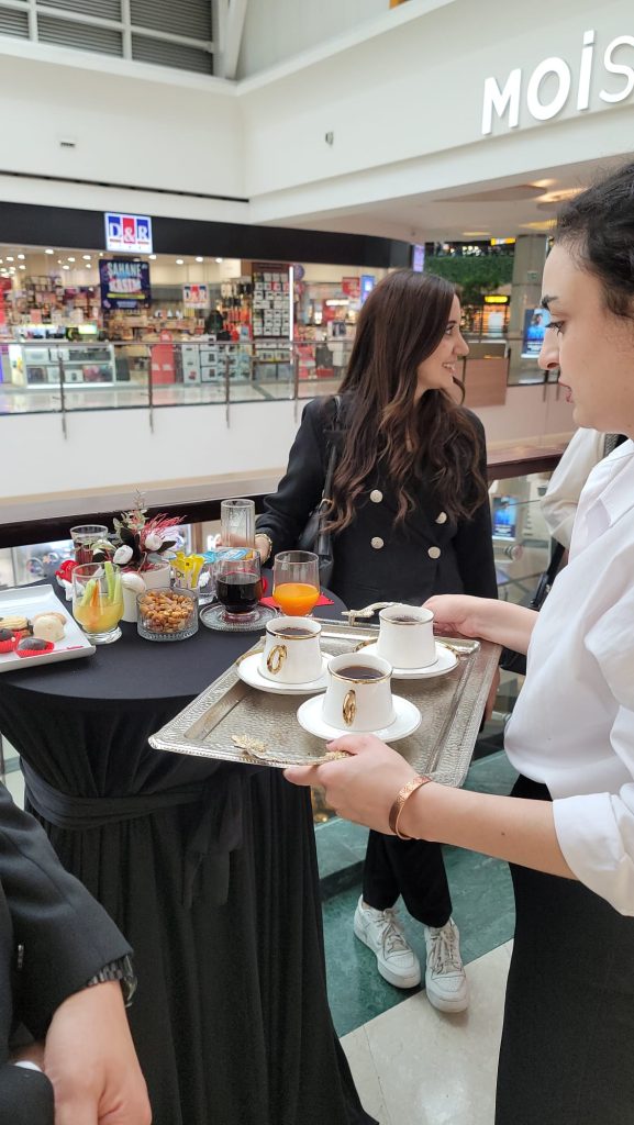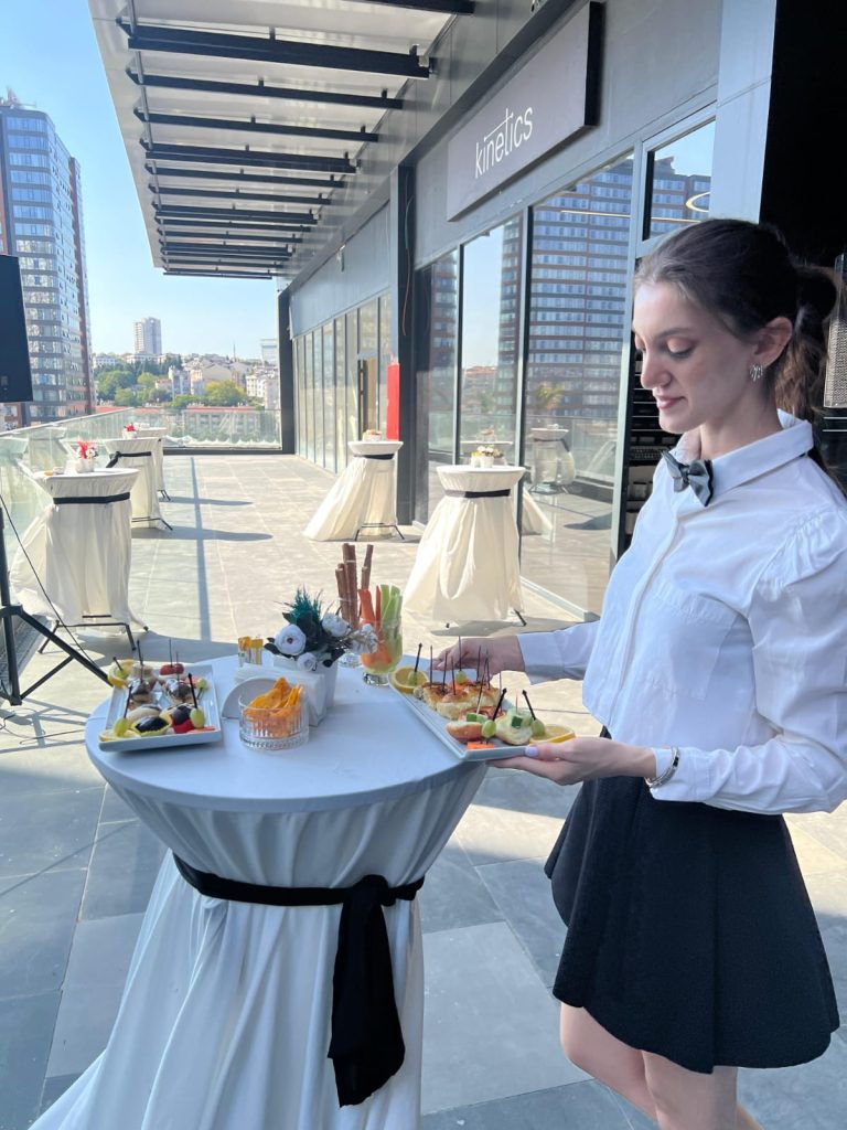 Kokteyl formatına uygun şekilde ikramlar porsiyonlanır; servis personeli akışı yöneterek hızlı ve düzenli servis sağlar.