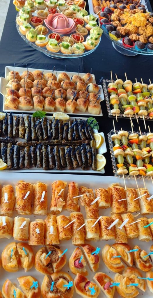 - Mini ekler, tart ve kanepe çeşitlerinin düzenli dizilimi