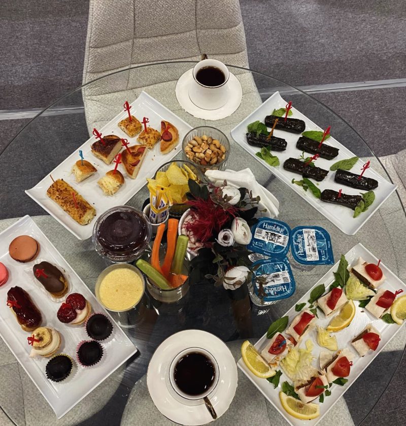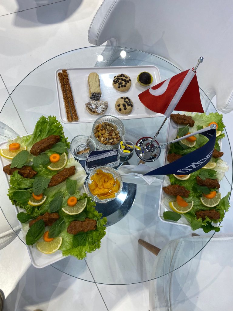Fuar temposuna uygun, pratik servis edilebilen tatlı-tuzlu ikramlar hazırlanır. Sunumlar, stand koşullarına göre cam/porselen ve şık ekipmanla kurulur.